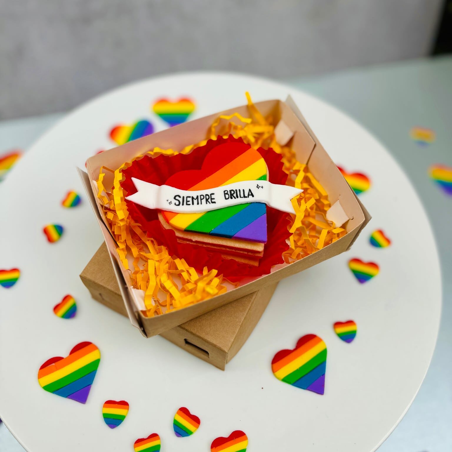 Este mes del Pride, celebra el amor y la autenticidad con nuestro alfajor en forma de corazón, decorado con fondant en los vibrantes colores de la bandera Pride y un banner que dice “Siempre Brilla”.