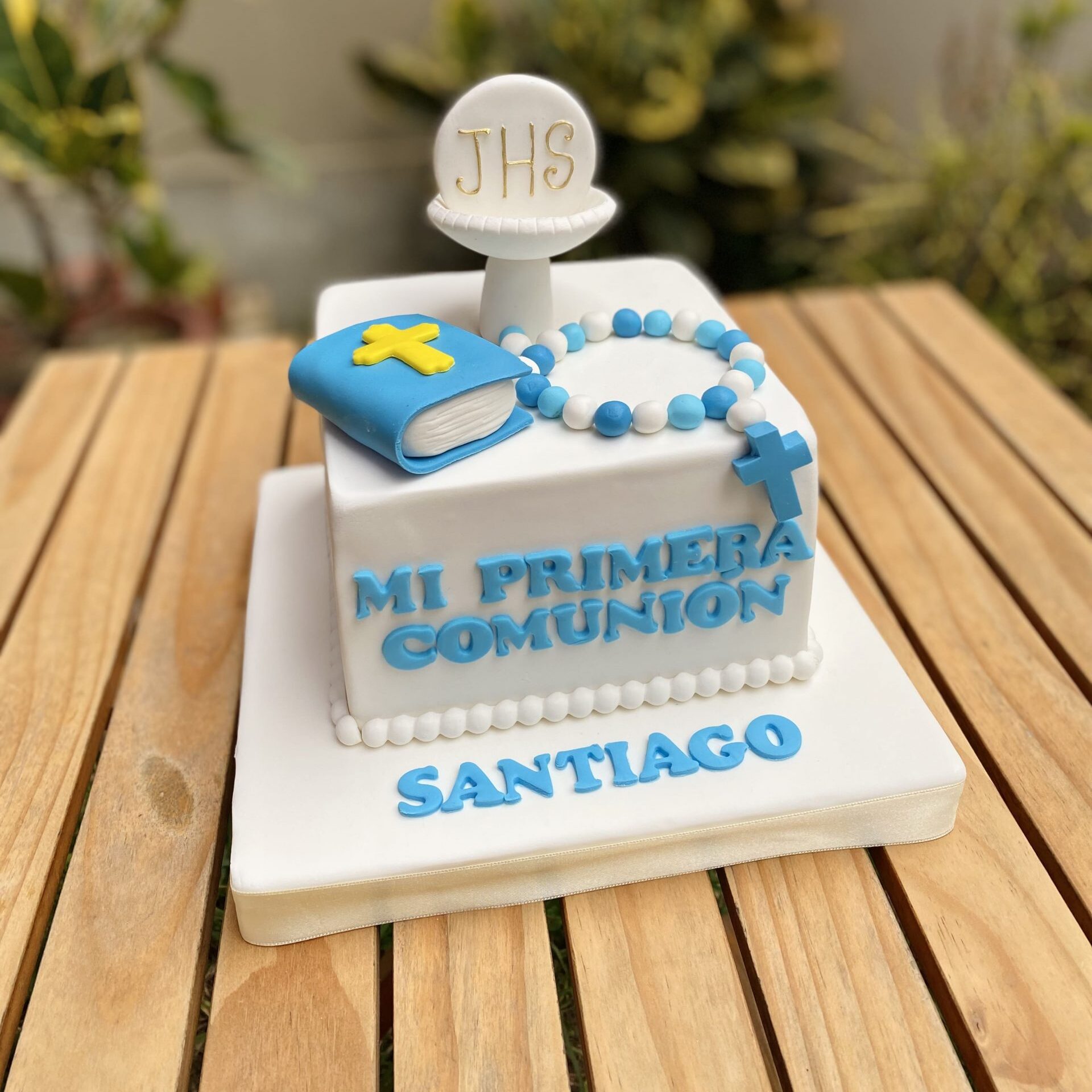 • Frase “Mi Primera Comunión” en fondant, un mensaje central que enmarca la ocasión y celebra este momento tan especial.