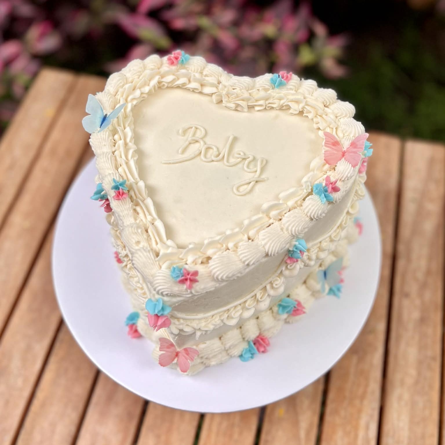 Una torta en forma de corazón bañada en suave buttercream blanco, con la palabra “Baby” en el centro como protagonista de este diseño tan delicado. Está decorada con hermosas mariposas de papel de arroz en tonos rosado y celeste, que parecen volar sobre cada detalle. Los pequeños toques de buttercream rosado y celeste le dan el equilibrio perfecto entre ternura y elegancia.