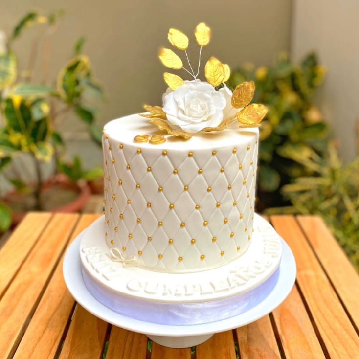 La opción perfecta para quienes desean una decoración sofisticada y texturizada. Con su característico diseño capitoné, que imita el efecto acolchado, esta torta aporta un aire de lujo y delicadeza a tu gran día. Decorada con flores y hojitas de azúcar, perlas comestibles y un topper con iniciales personalizado. El acabado en fondant y el relieve en forma de rombos hacen que cada detalle destaque con elegancia.