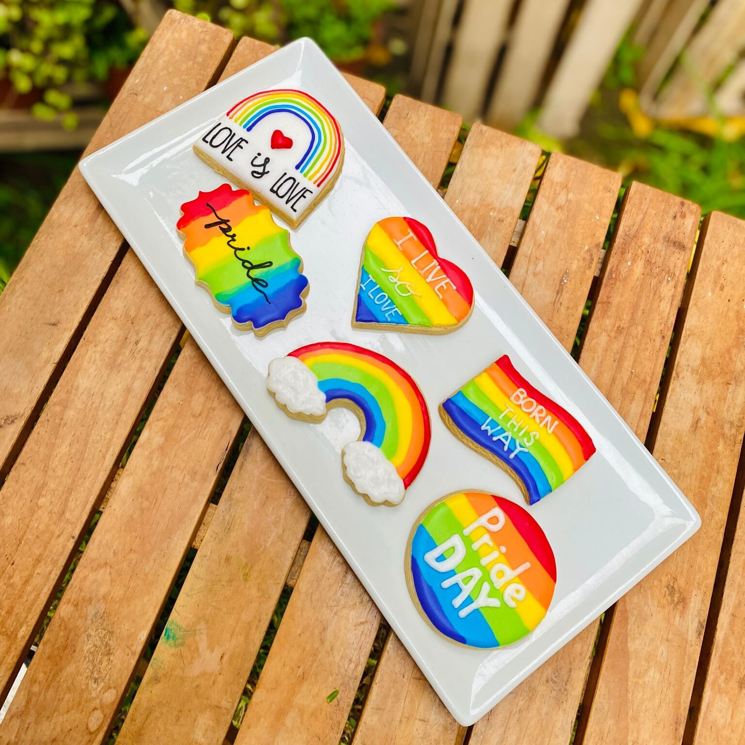 Celebra el orgullo, la diversidad y el amor auténtico con nuestro vibrante set de 6 galletas decoradas especialmente para el Pride. Este pack incluye diseños llenos de color y significado, como la palabra “Pride”, frases como “Born This Way” e “I Live So I Love”, todos decorados con los colores de la bandera del arcoíris.