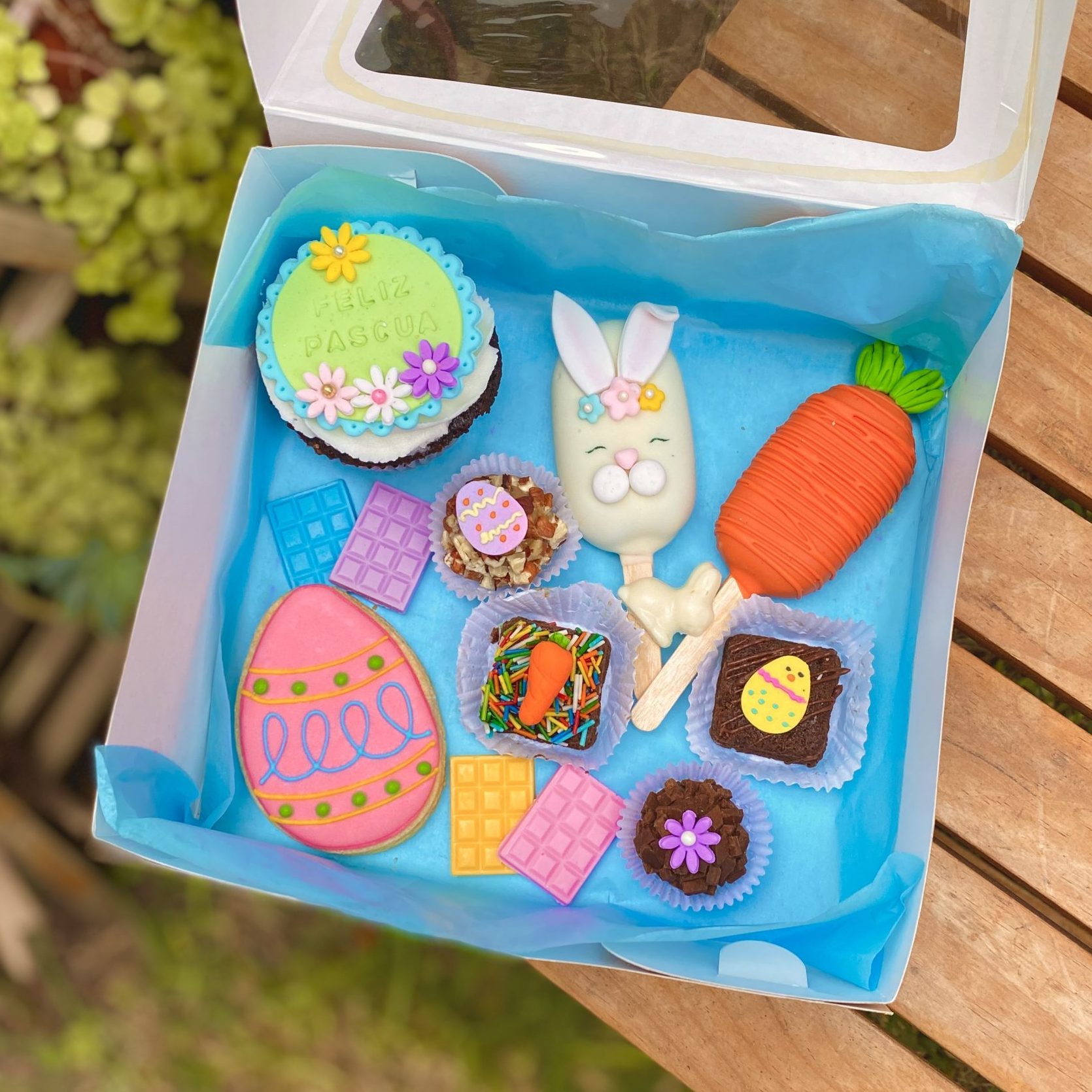– Variedad Festiva: Este Box Sorpresa Pascua presenta una variedad de 8 postres temáticos, incluyendo un cupcake decorado, lacepops con forma de conejito y zanahoria, una galleta decorada en glasé, mini brownies especiales con detalles de zanahoria y huevito, trufas adornadas con motivos de Pascua, y mini barritas de chocolate de color.