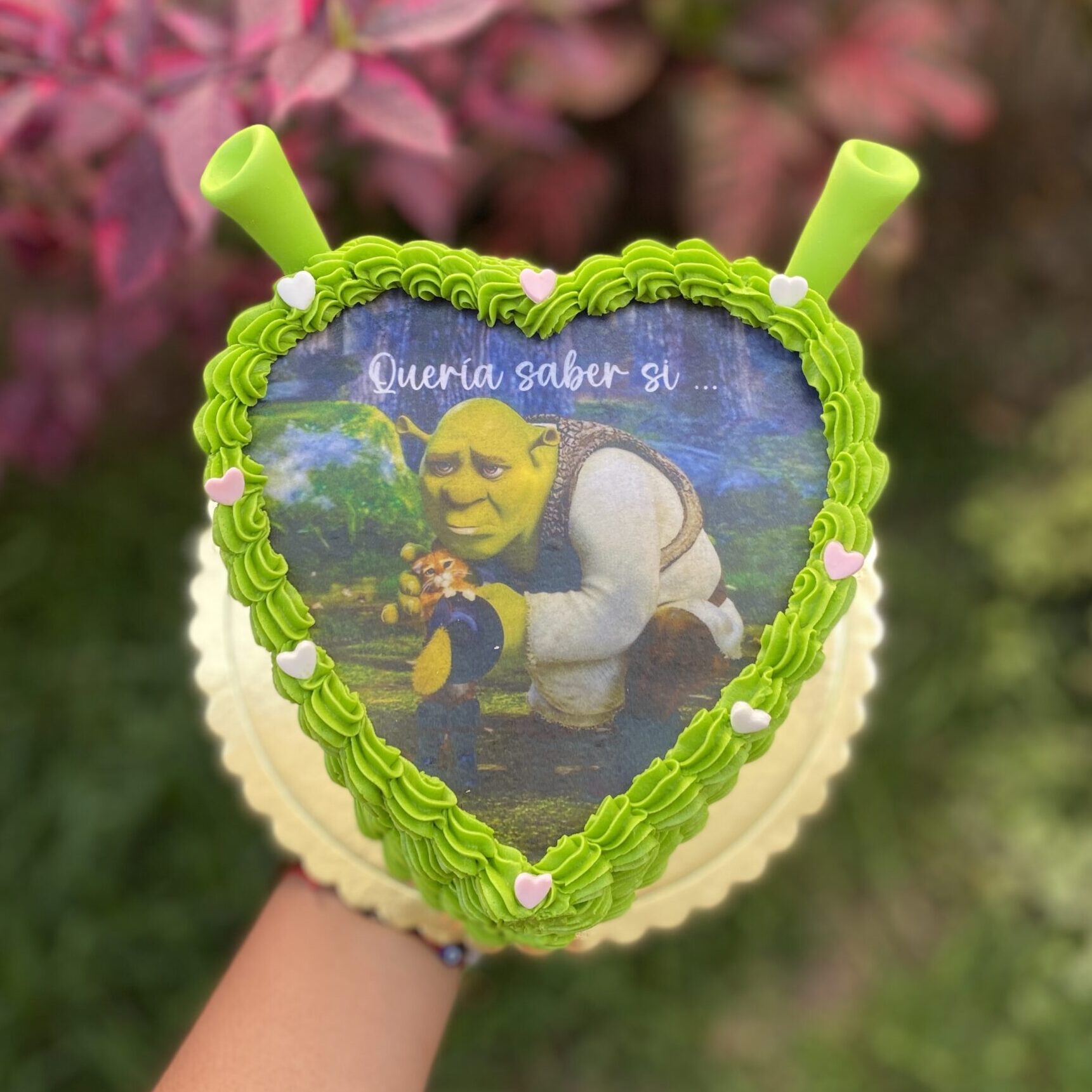 - Decoración: Buttercream en tonos verdes, con detalles románticos de corazoncitos.