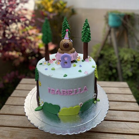 Un capibara con tutú y gorrito de cumpleaños se roba todas las miradas en esta torta llena de encanto.  Rodeado de arbolitos, flores y hojitas, este diseño combina la magia de la naturaleza con la alegría de una celebración especial.
