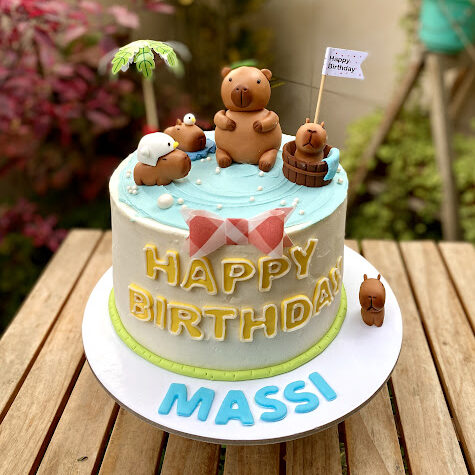 Sumérgete en un mundo de ternura con esta adorable torta que recrea una refrescante escena de capibaras disfrutando del agua. Cuatro capibaras flotan felices, cada una con su propio estilo: uno con un gorrito de pollito, otro con un pollito en la cabeza, uno relajado sentado y otro disfrutando dentro de un balde. La decoración se completa con una palmera que le da el toque tropical perfecto, mientras que en la base de la torta, un capibara más observa la escena con calma. ¡Es la combinación ideal entre frescura, ternura y sabor!