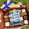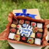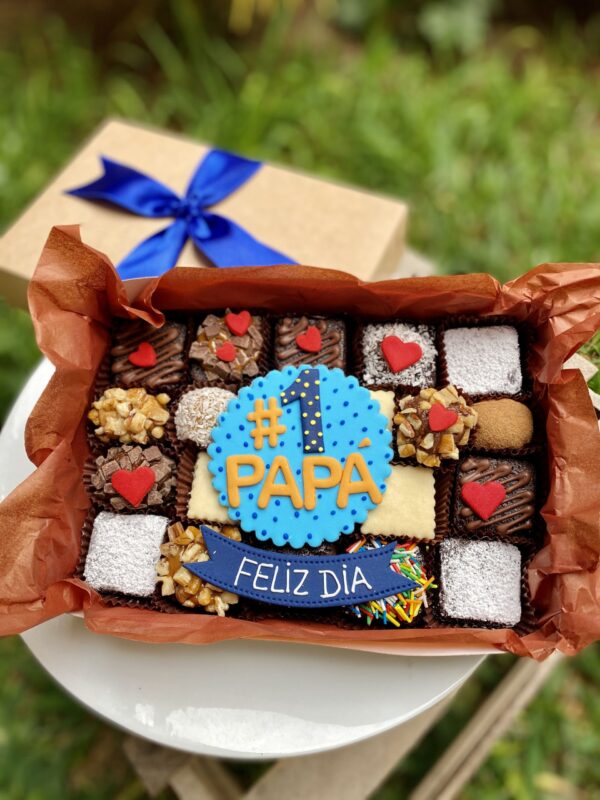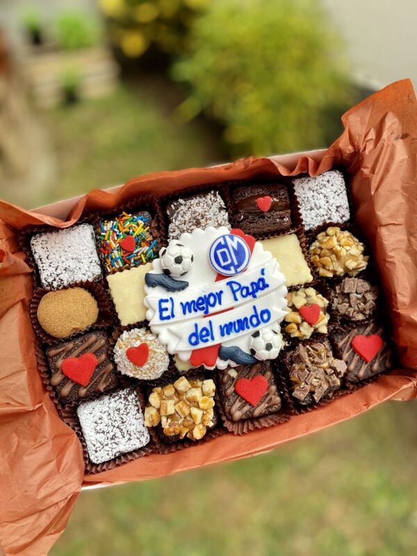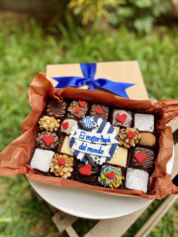 Caja ecológica con lazo 🎁 de 21 postrecitos 😋 100% caseros y combinados entre alfajorcitos, brownies y trufas bañadas en canela, pecanas, coco y más !