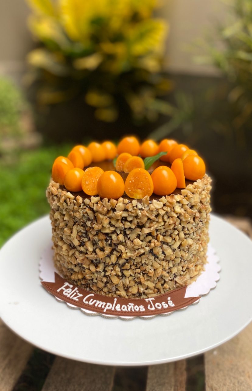 Deliciosa torta de queque chocolate húmedo relleno de fudge o manjar, bañado en fudge con nueces y decorado de aguaymanto, un contraste de sabor increíble.