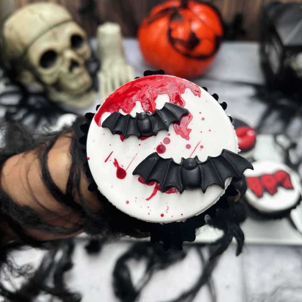 • Decoración: Fondant con detalles temáticos de Halloween (dedos cortados, murciélagos, fantasmas y frases de terror)
