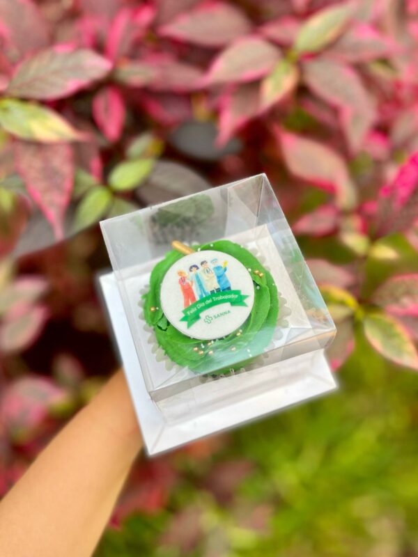 Topper Especial: Completa la presentación con un topper especial que lleva la frase «Feliz Día del Trabajador», transmitiendo un mensaje de reconocimiento y gratitud por su esfuerzo diario. Además, podemos personalizarlo con el logo de tu empresa para que el detalle tenga aún más identidad y cercanía.