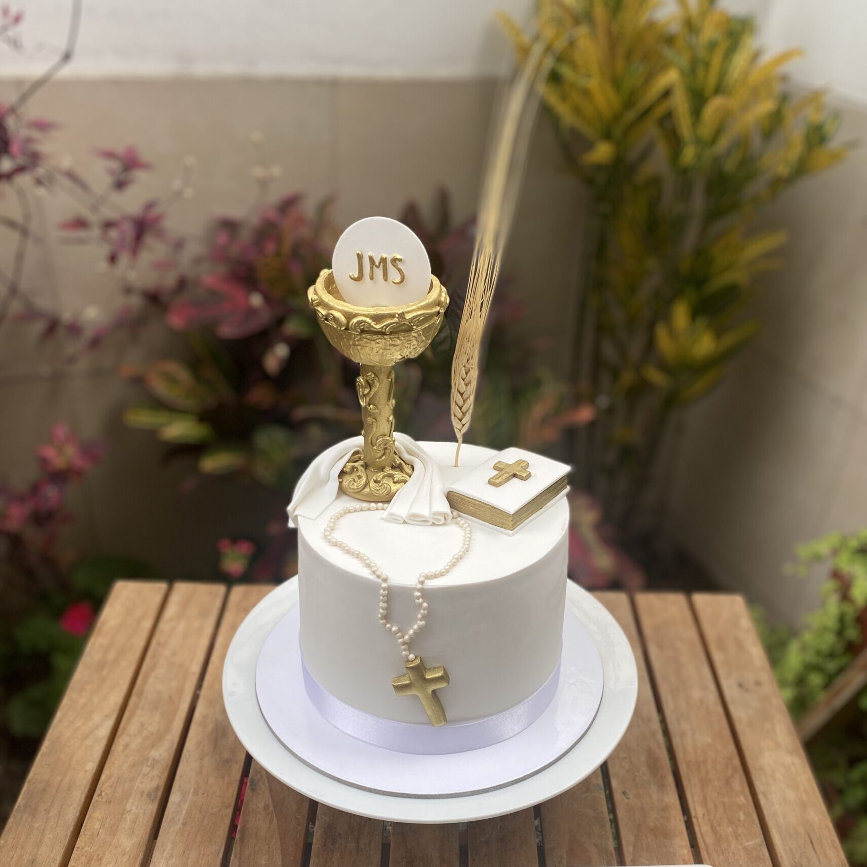 Incluye figuras modeladas en fondant como un cáliz, un rosario y una biblia, cuidadosamente trabajadas a mano para transmitir fe y dulzura en cada detalle.