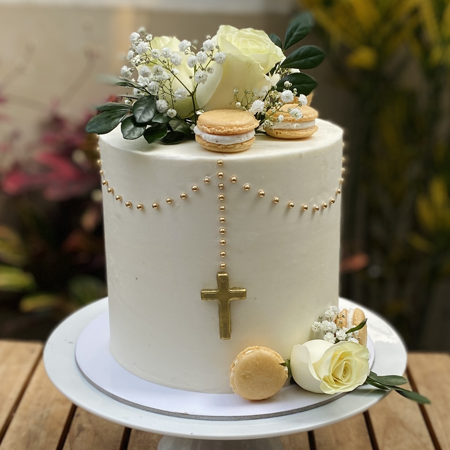 Torta de un piso diseñada con un estilo delicado y elegante, perfecta para celebrar una Primera Comunión. Está decorada con macarons franceses que aportan un toque sofisticado, flores naturales que llenan de frescura el diseño y perlas comestibles que añaden brillo y sutileza. En el centro, una cruz de fondant resalta el significado espiritual de la ocasión, convirtiendo esta creación en el detalle ideal para un momento tan especial.