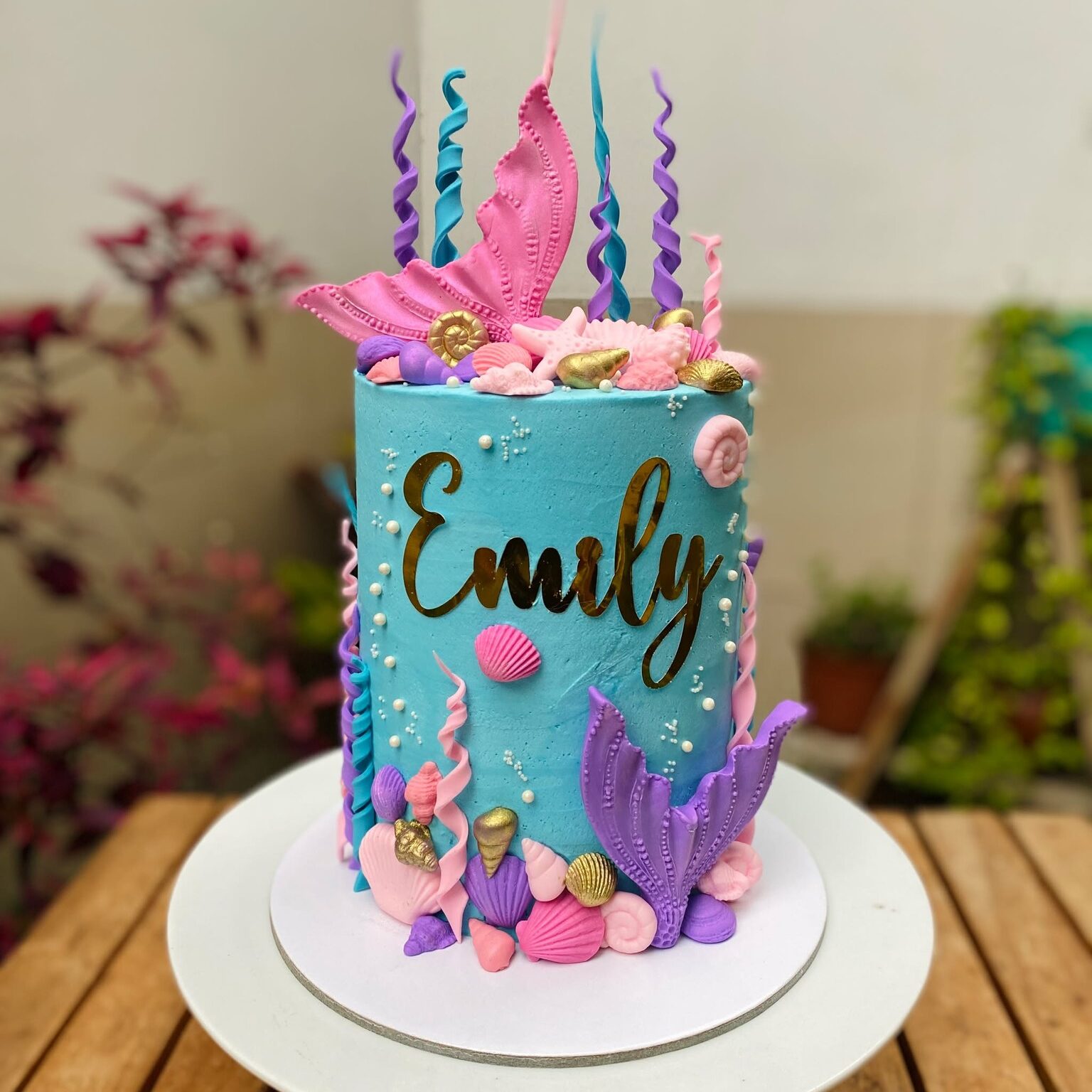 Déjate llevar por la magia del océano con esta encantadora torta de un piso bañada en buttercream. Colas de sirena, conchitas, estrellas de mar y algas en fondant decoran cada rincón, creando una escena submarina llena de color y fantasía.