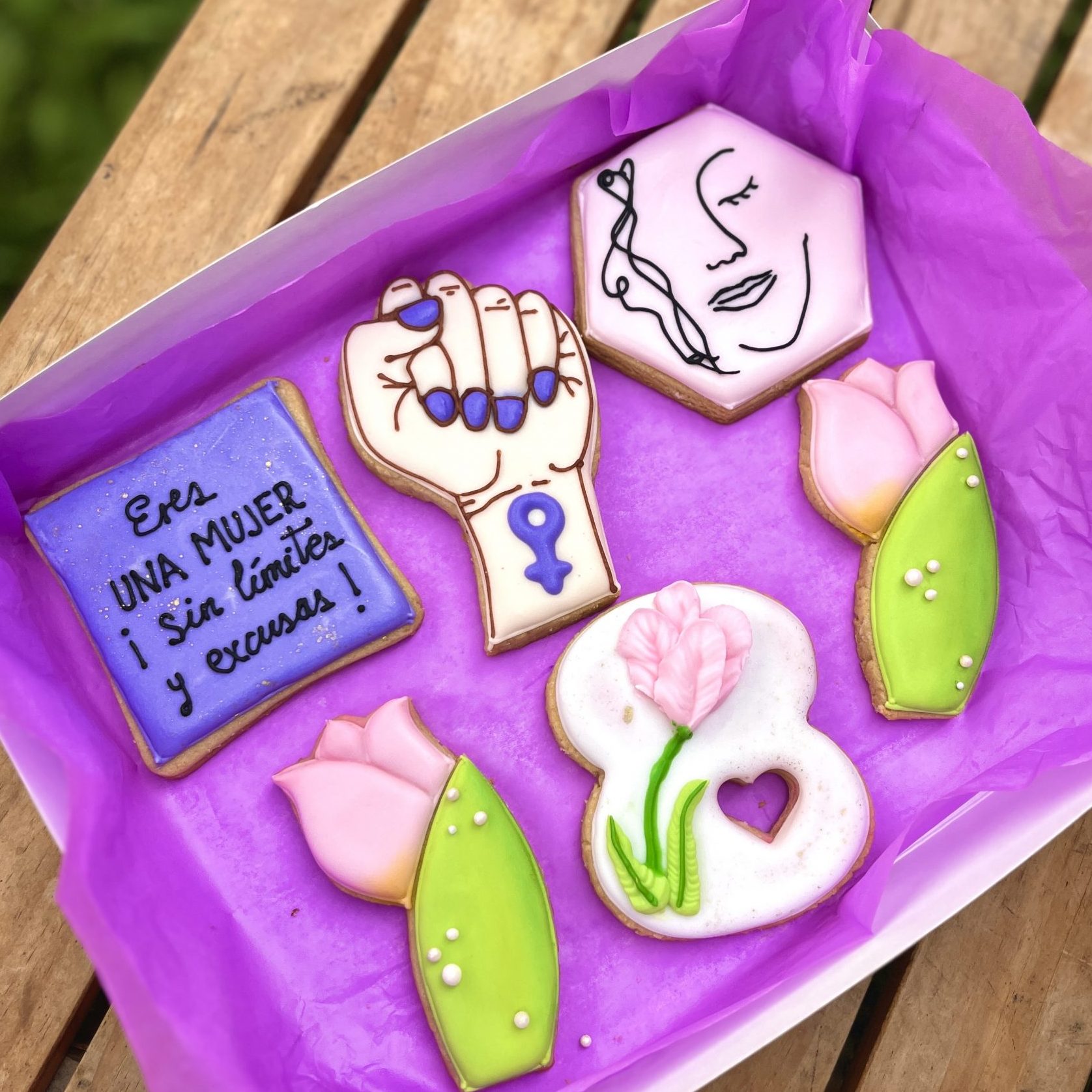 – 1 galleta con la representación del puño de una mujer, con manicura color lila, y el símbolo de la mujer en color lila debajo de la palma, simbolizando la fuerza y el poder femenino.