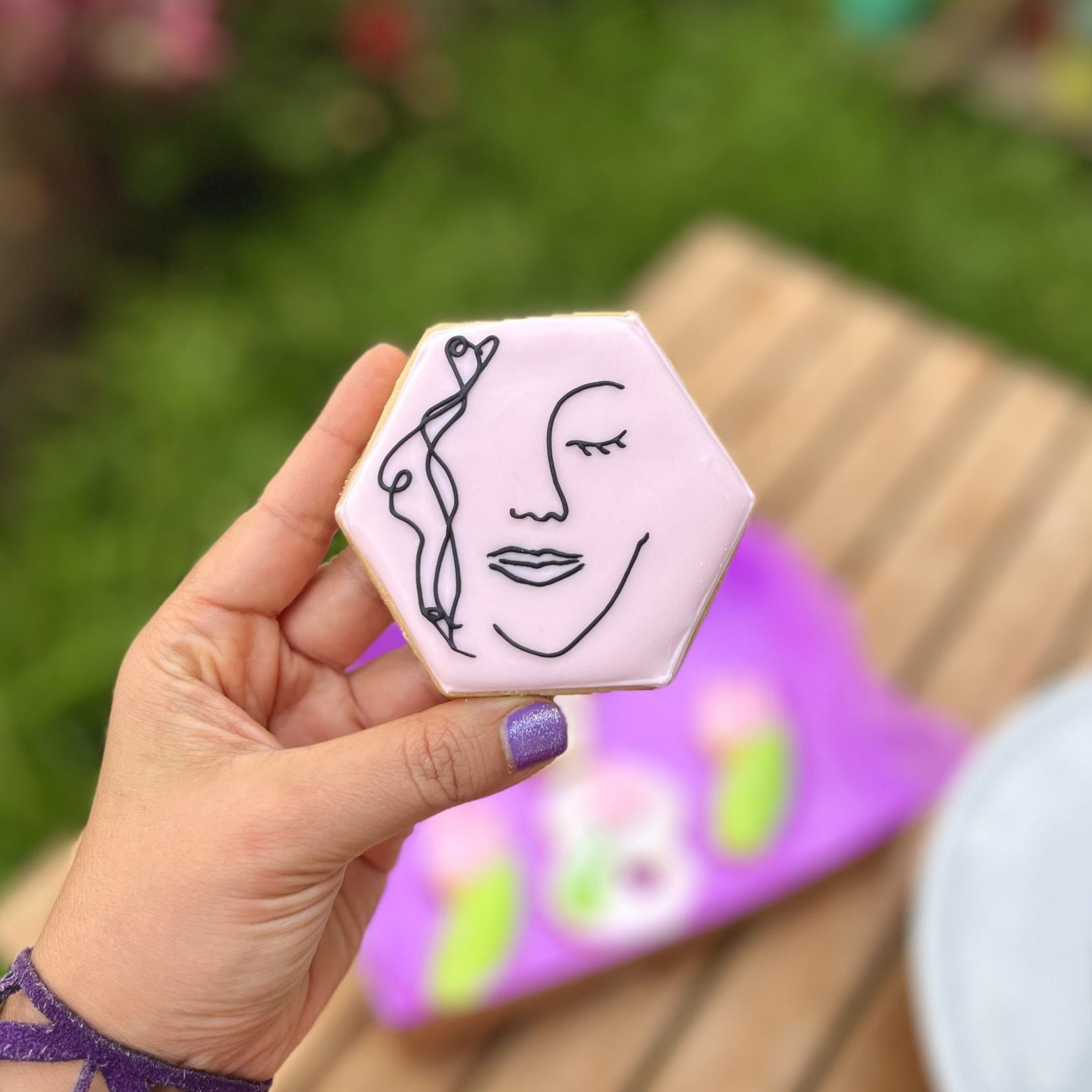 – 1 galleta con forma exagonal, adornada con el delineado del rostro de una mujer, destacando la belleza y la individualidad de cada mujer.