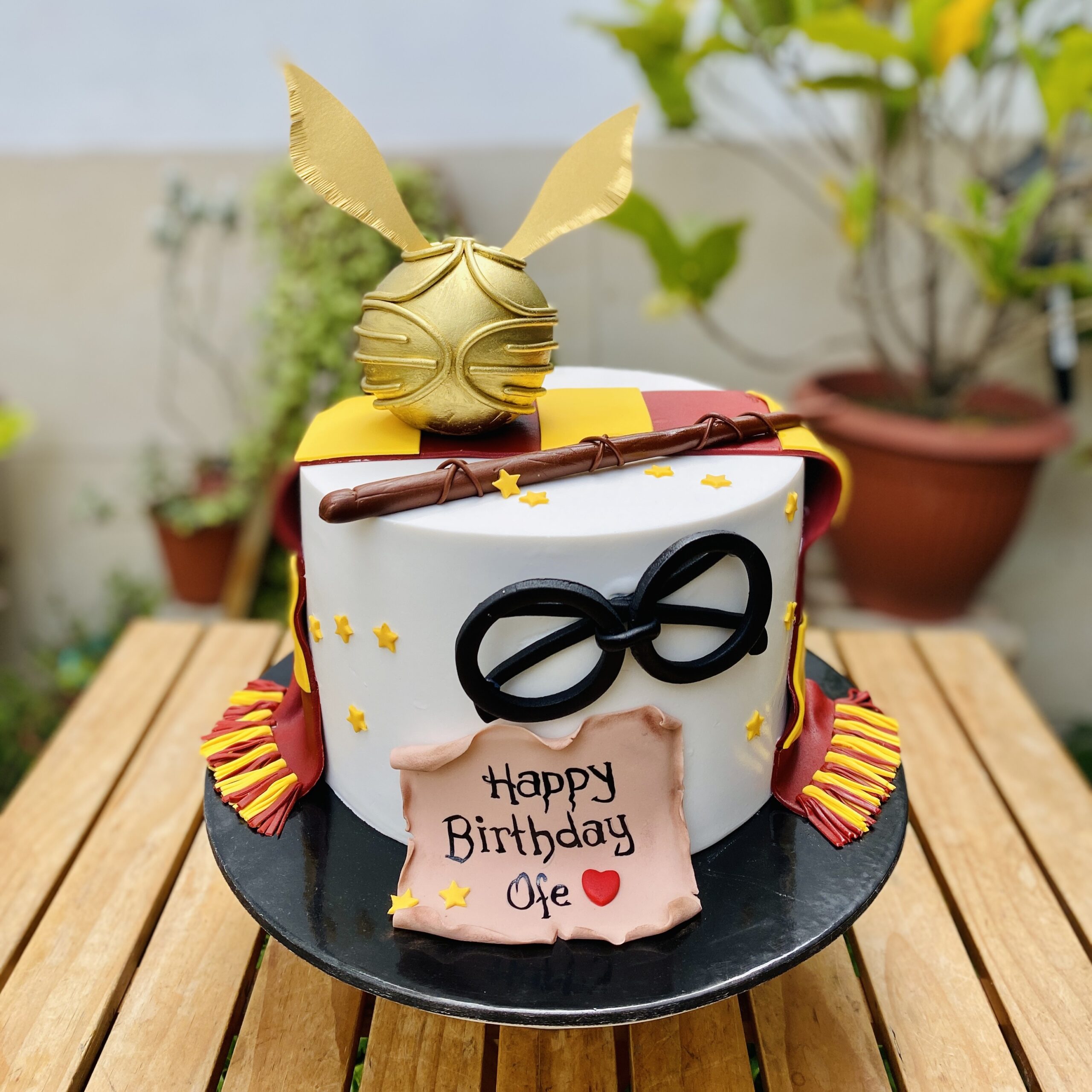 • Decoraciones en fondant: los icónicos lentes, la bufanda de Gryffindor, la varita y estrellitas que evocan el mundo mágico.