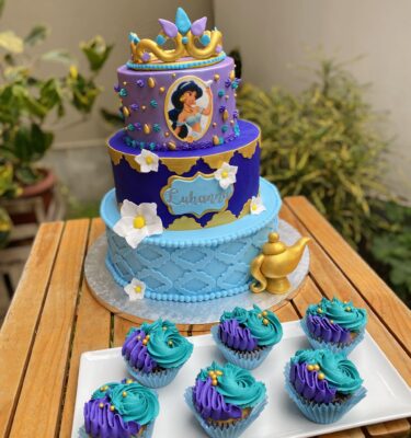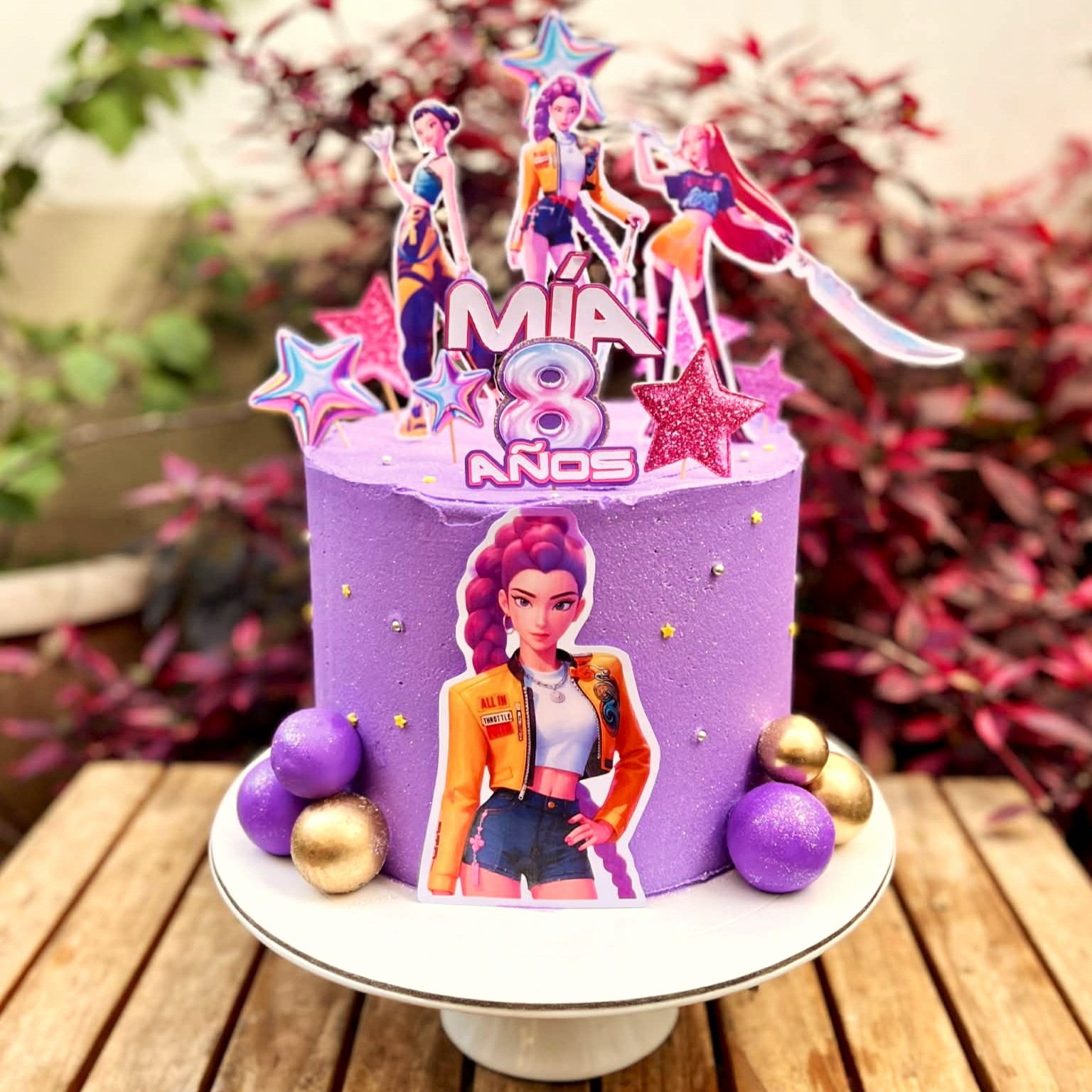 Nuestra torta temática de las guerreras K-Pop está bañada en buttercream glitter, logrando un acabado brillante y lleno de actitud. La decoración se complementa con toppers de cartulina que refuerzan el concepto y aportan un toque moderno y divertido.