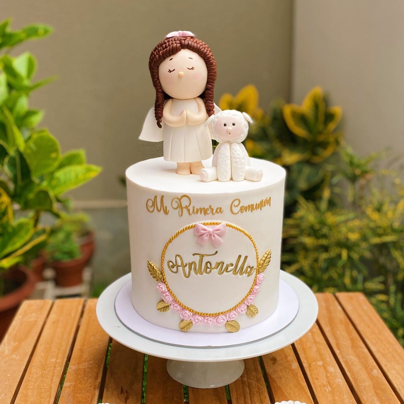 Una creación de un piso, forrada en fondant y decorada con ternura para una ocasión especial. La angelita y la ovejita modeladas en 3D de azúcar aportan un aire encantador y lleno de inocencia, mientras el marco de fondant con delicadas flores enmarca la frase “Mi Primera Comunión” en cartulina dorada satinada. Cada detalle, desde la personalización de nombre en dorado hasta los acabados finos, convierte a esta torta en el centro perfecto para celebrar la fe y la pureza de este día tan importante.