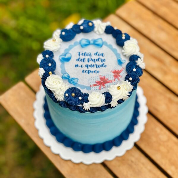 ¡Celebra el Día del Padre con nuestra exclusiva Torta de Papá! Esta deliciosa mini torta de chocolate, perfecta para 6-8 porciones, está rellena de manjar y cubierta con buttercream en tonos azules y celestes. Adornada con encantadores detalles, es la elección ideal para aquellos padres que aprecian el estilo y la sofisticación.