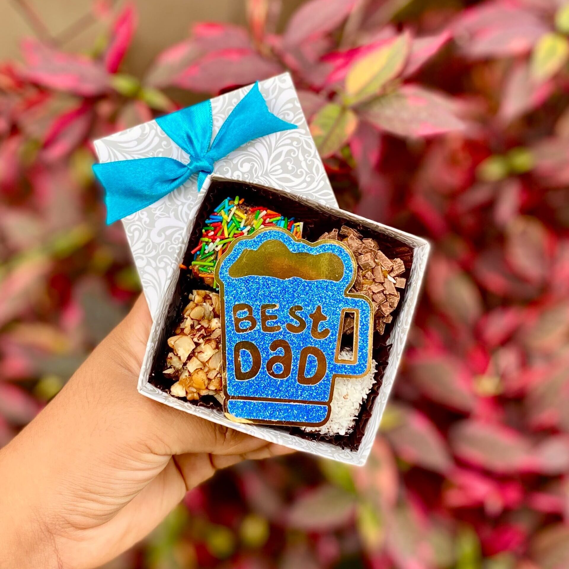 Cada Mini Four Best Dad está cuidadosamente elaborado con nuestro clásico fudge de chocolate, grageas crocantes, pecanas, coco y un toque final de rayitas de chocolate que aportan una mezcla irresistible de sabores y texturas en cada bocado.