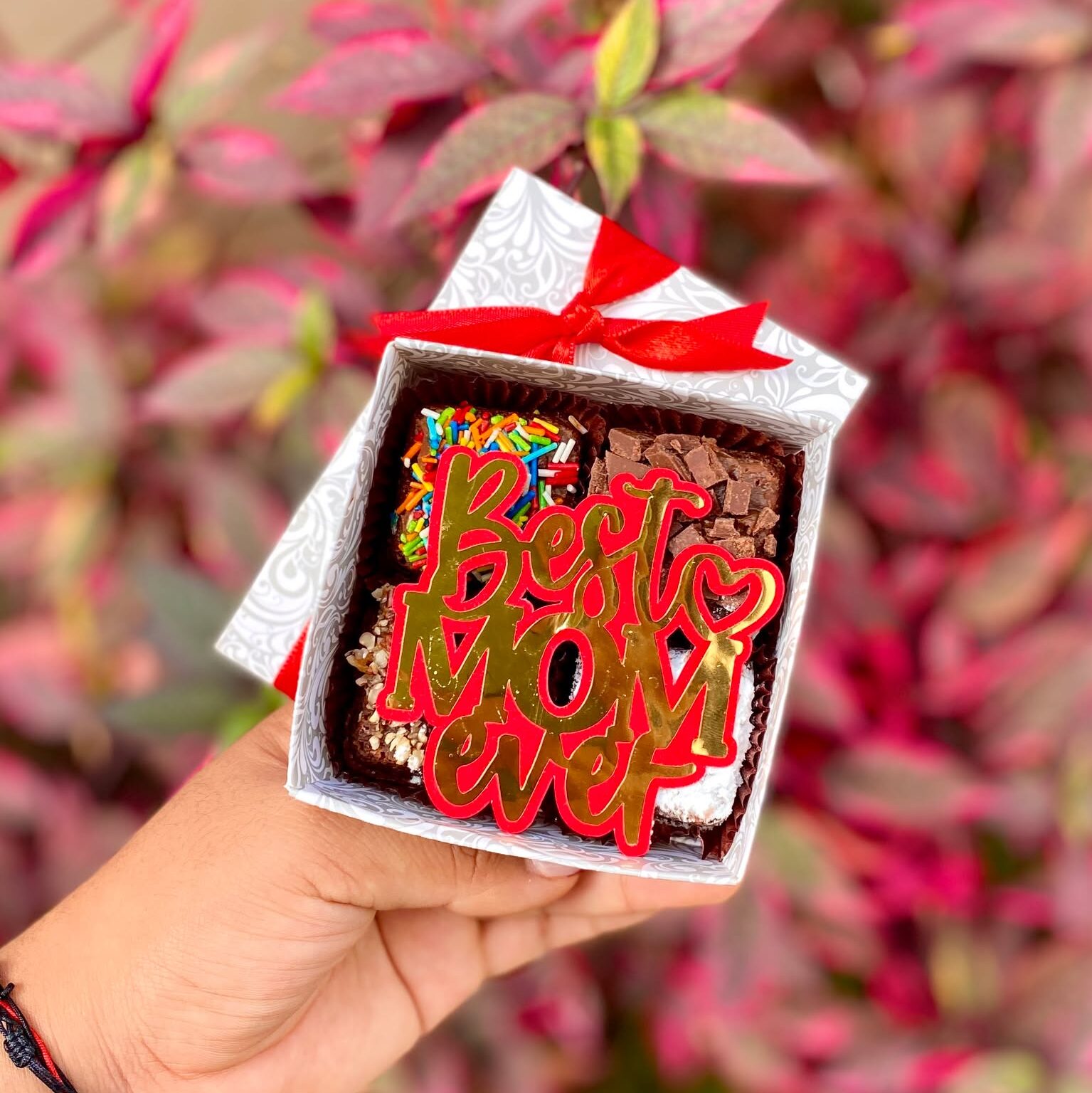 Cada Mini Four Best Mom está cuidadosamente elaborado con fudge de chocolate, grageas de colores, pecanas, coco y rayitas de chocolate, creando una combinación irresistible de sabores y texturas en cada bocado.
