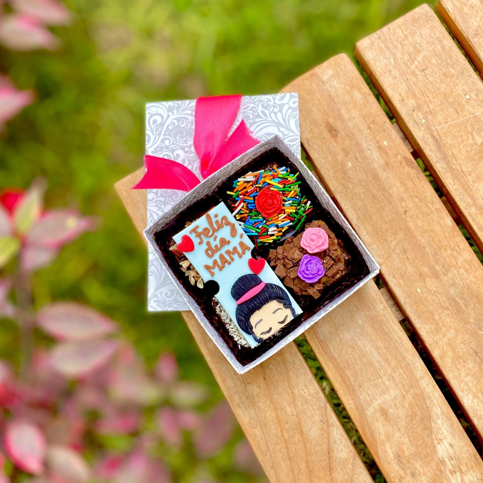 Además, cada mini four viene con un topper de fondant encantador, una pequeña obra de arte que muestra medio rostro de una mujer con cabellos negros, junto con la frase que la homenajea: «Feliz día Mamá». Es el detalle perfecto para expresarle todo tu amor en su día especial.