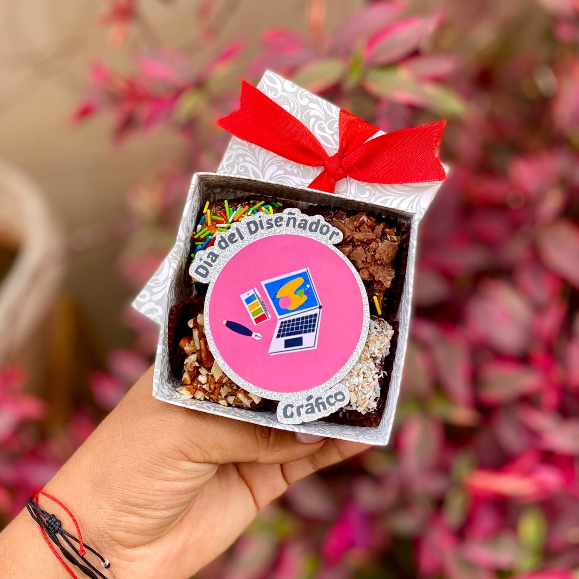 ¡Prepárate para disfrutar de un festín de sabores con nuestro Mini Four Design! Cada pequeño postre está cuidadosamente elaborado con una base de fudge y adornado con grageas de colores, pecanas, coco y rayitas de chocolate, creando una combinación irresistible para tu paladar.