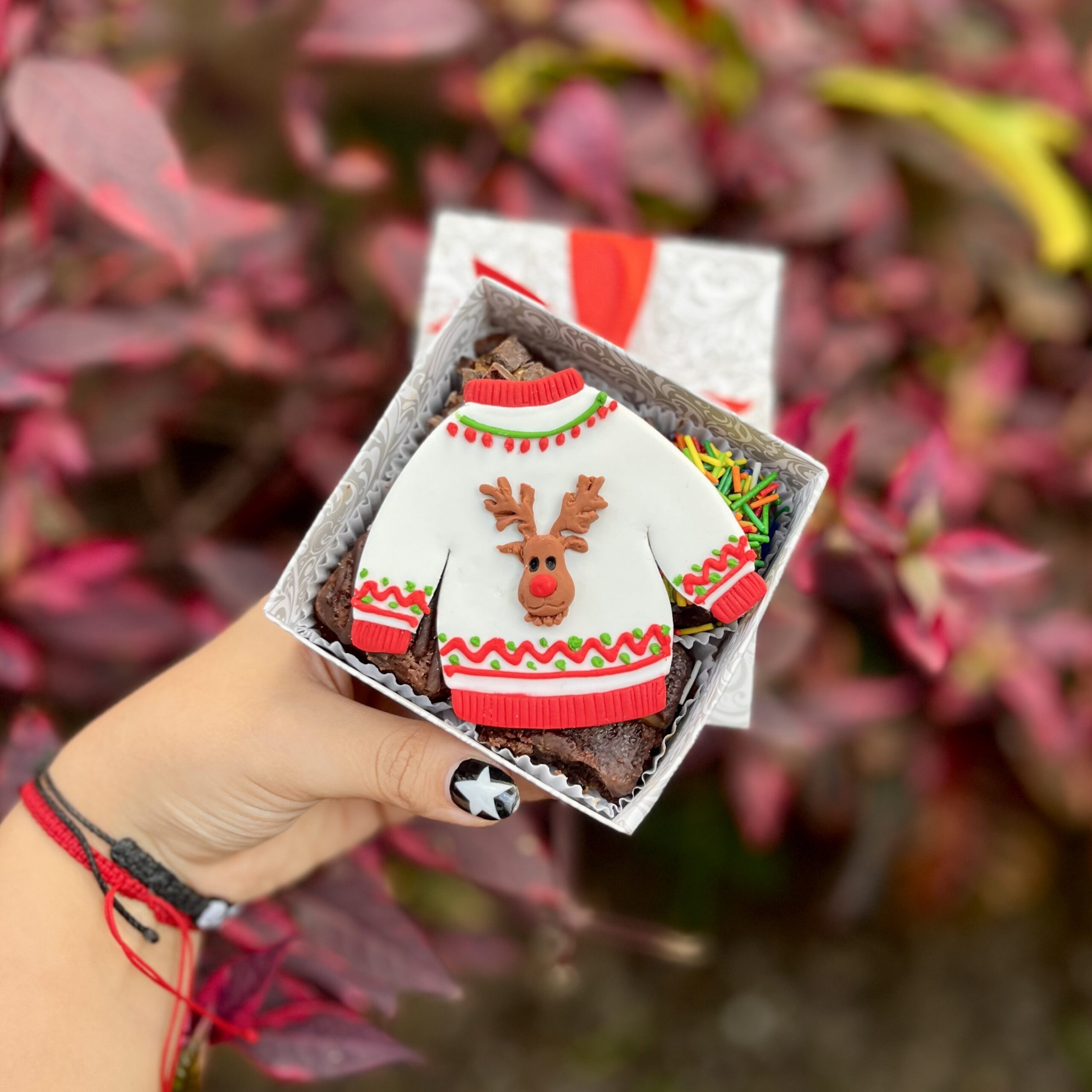 Nuestro Mini Four Navideño reúne 4 deliciosos brownies de chocolate con una tierna decoración en fondant inspirada en un suéter navideño.