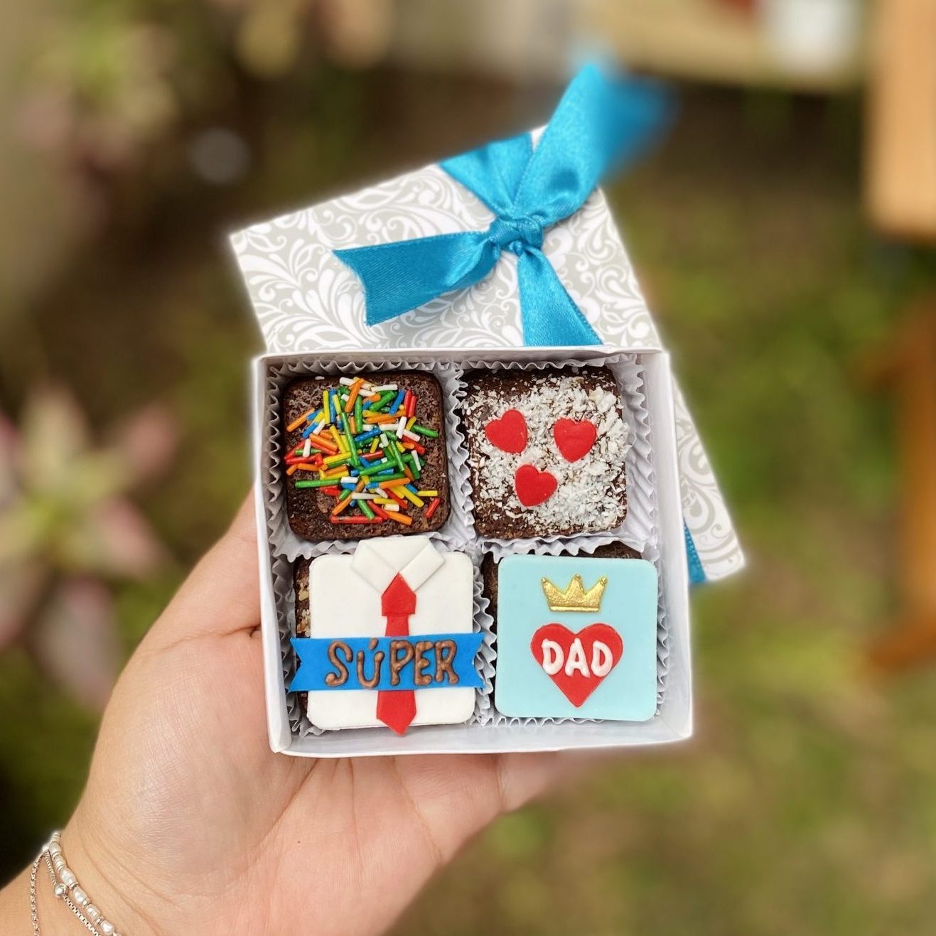 Contiene: 04 mini brownies especiales 01 topper de fondant CAMISITA 01 topper de fondant DAD ♥