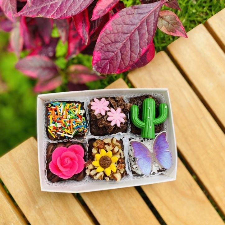 Dale la bienvenida a la primavera con nuestro Mini Six Dulce Brotar, una colección de 6 postrecitos irresistibles. Cada uno está adornado a mano con fondant, presentando encantadoras decoraciones primaverales como delicadas flores, maripositas y un pequeño cactus. Estos dulces están cubiertos con nuestros toppings más populares: fudge, grageas de colores, pecanas, sanguchito, trocitos de chocolate, coco y rayitas de chocolate.