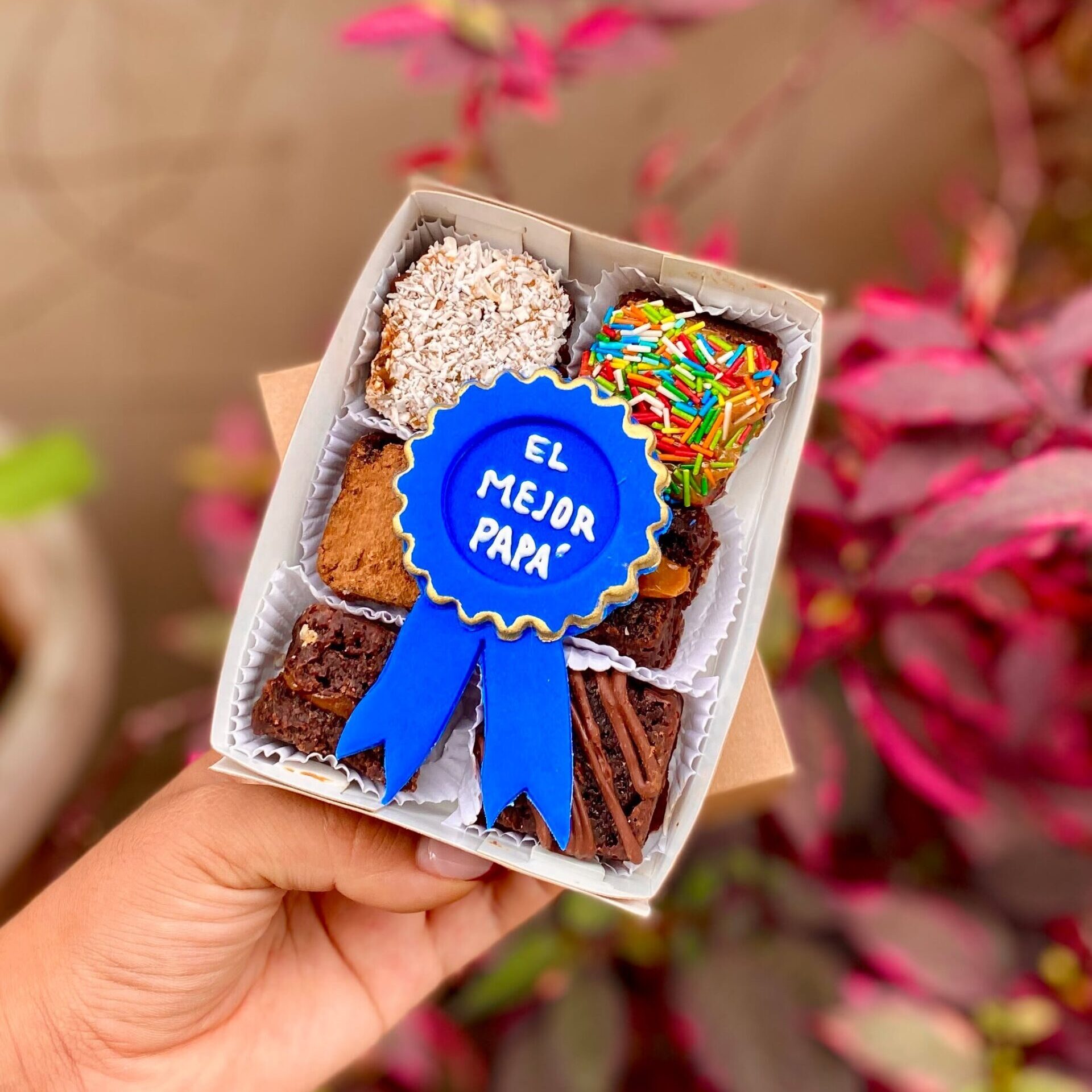 Cada cajita incluye 6 postrecitos de brownie elaborados con nuestra receta de fudge de chocolate, decorados con una deliciosa combinación de toppings: grageas de colores, pecanas, sanguchito, trocitos de chocolate, coco y rayitas de chocolate que lo van a conquistar desde el primer bocado.