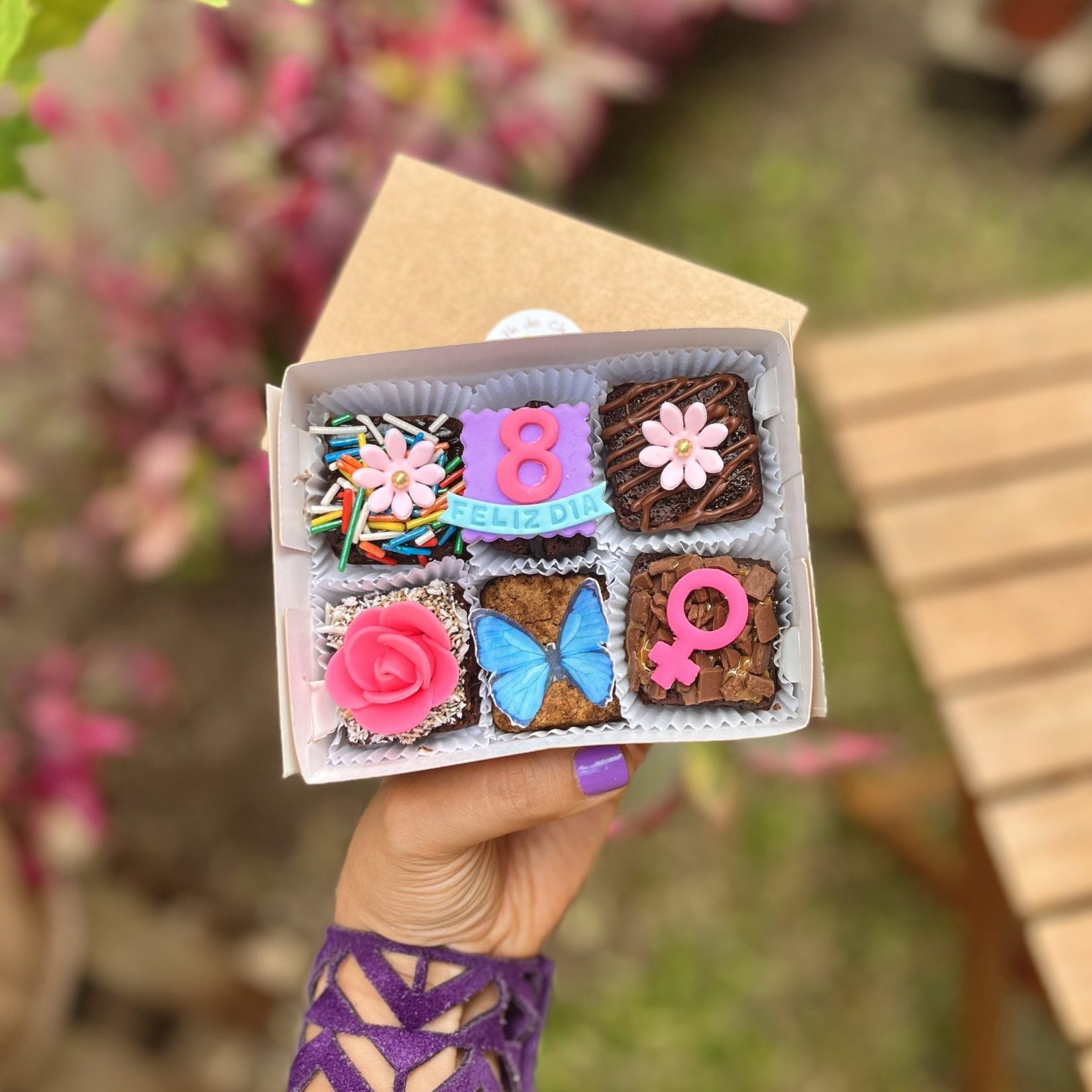– 1 con Símbolo de Mujer en Color Fucsia: Un brownie decorado con el símbolo de mujer en color fucsia, que celebra la fortaleza y la belleza de todas las mujeres.