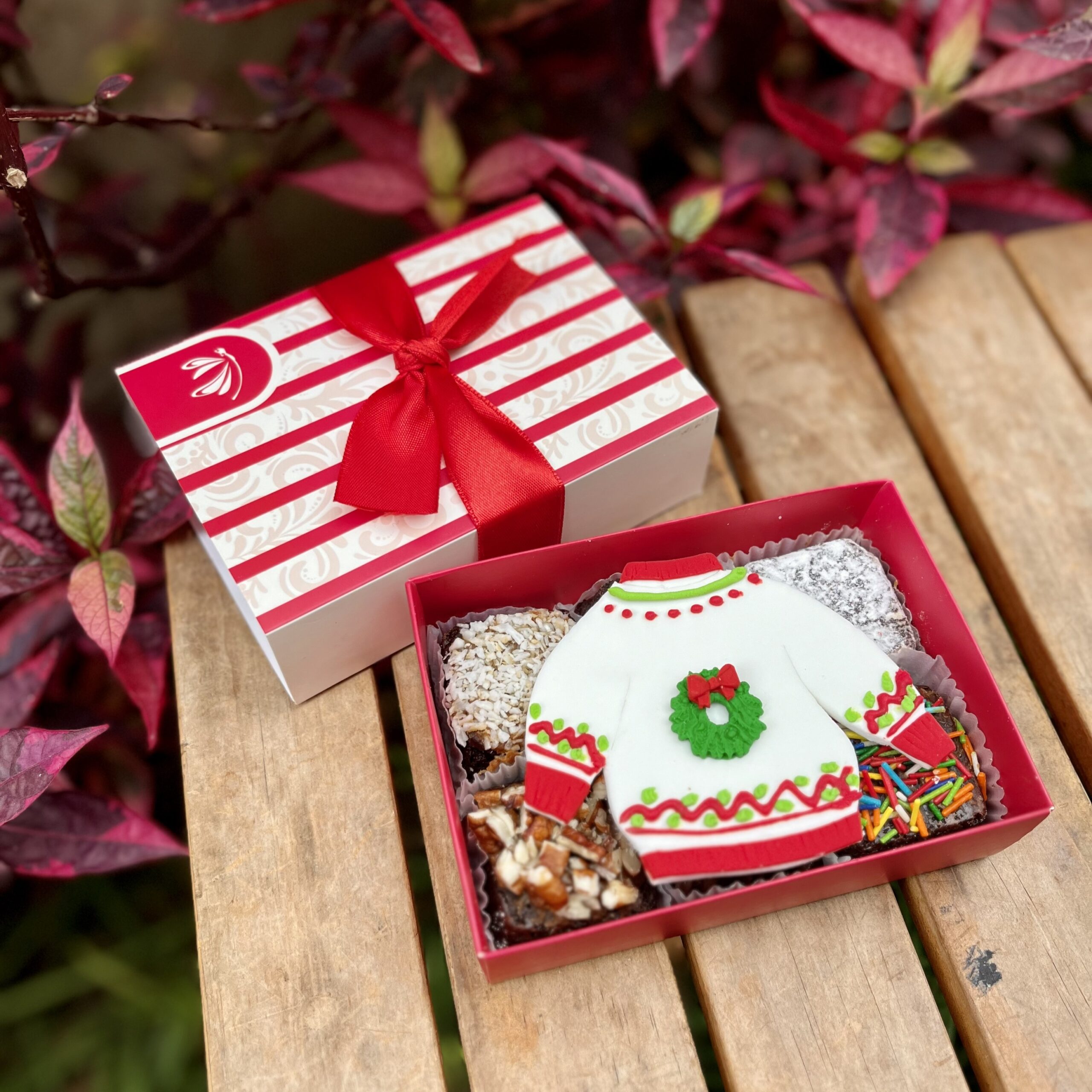 Nuestro Mini Six Suéter reúne 6 deliciosos brownies de chocolate decorados con un suéter navideño.