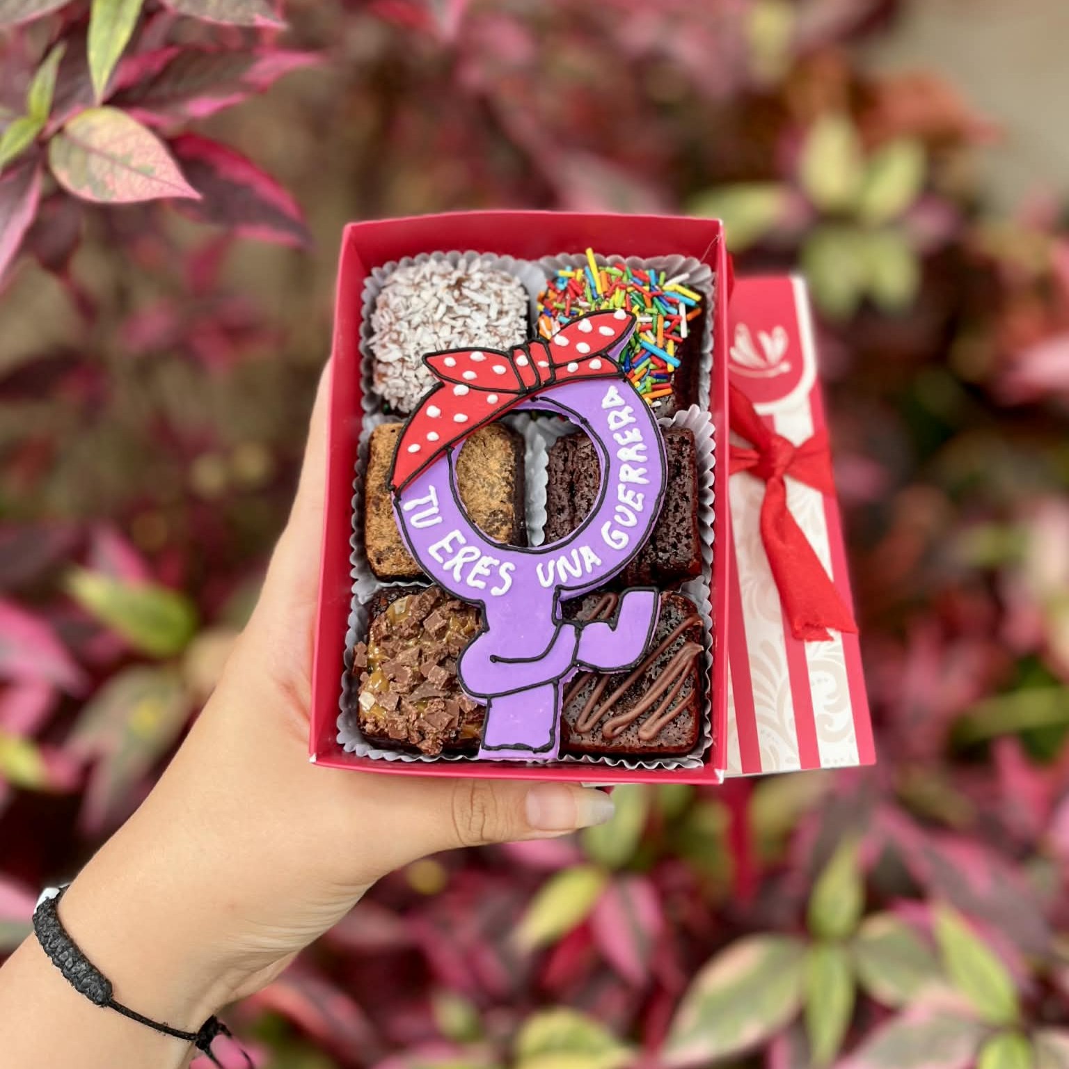 Nuestro Mini Six de Brownies por el Día de la Mujer es un detalle dulce pensado para celebrar esta fecha especial. Incluye 6 deliciosos brownies, acompañados de una decoración central inspirada en el símbolo de la mujer con bandana levantando el brazo y mostrando el músculo, una imagen que representa la fuerza, valentía y determinación de las mujeres.