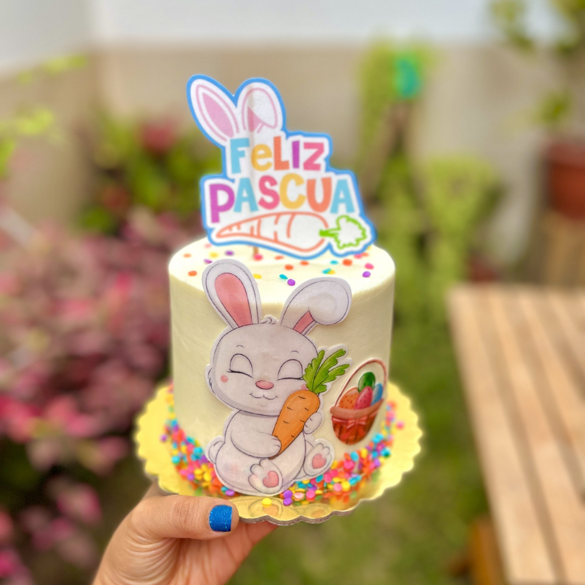– Toque Festivo: En la parte superior de la torta, encontrarás un topper con la dedicatoria «Feliz Pascua», agregando un toque festivo y alegre a esta deliciosa creación.
