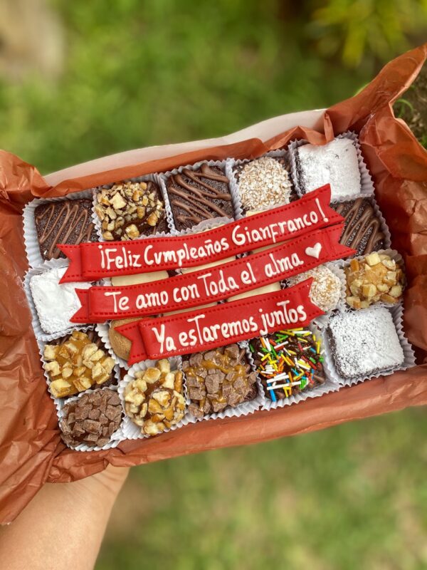Cada caja está llena de exquisitos postrecitos, decorados con mensajes y diseños personalizados para la ocasión. Ya sea un mensaje de felicitación, el nombre del cumpleañero o cualquier frase especial que desees, nuestro Mix Box de Cumpleaños hará que el día sea inolvidable.