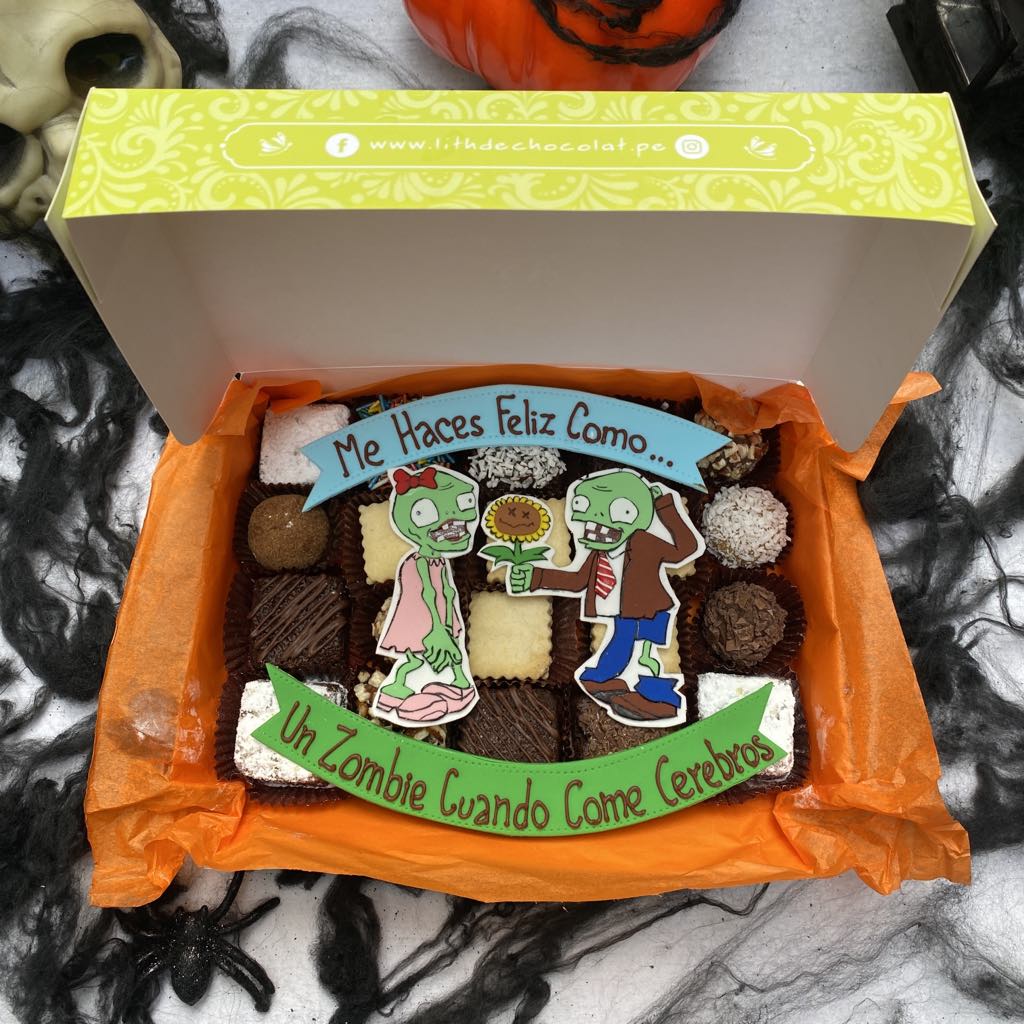 Cada Mix Box Zombie in Love está empaquetado en una hermosa caja verde, con un papel de seda naranja, que le da un toque sofisticado y festivo. Perfecto para regalar o para disfrutar estas celebraciones terroríficas. Todo es comestible!