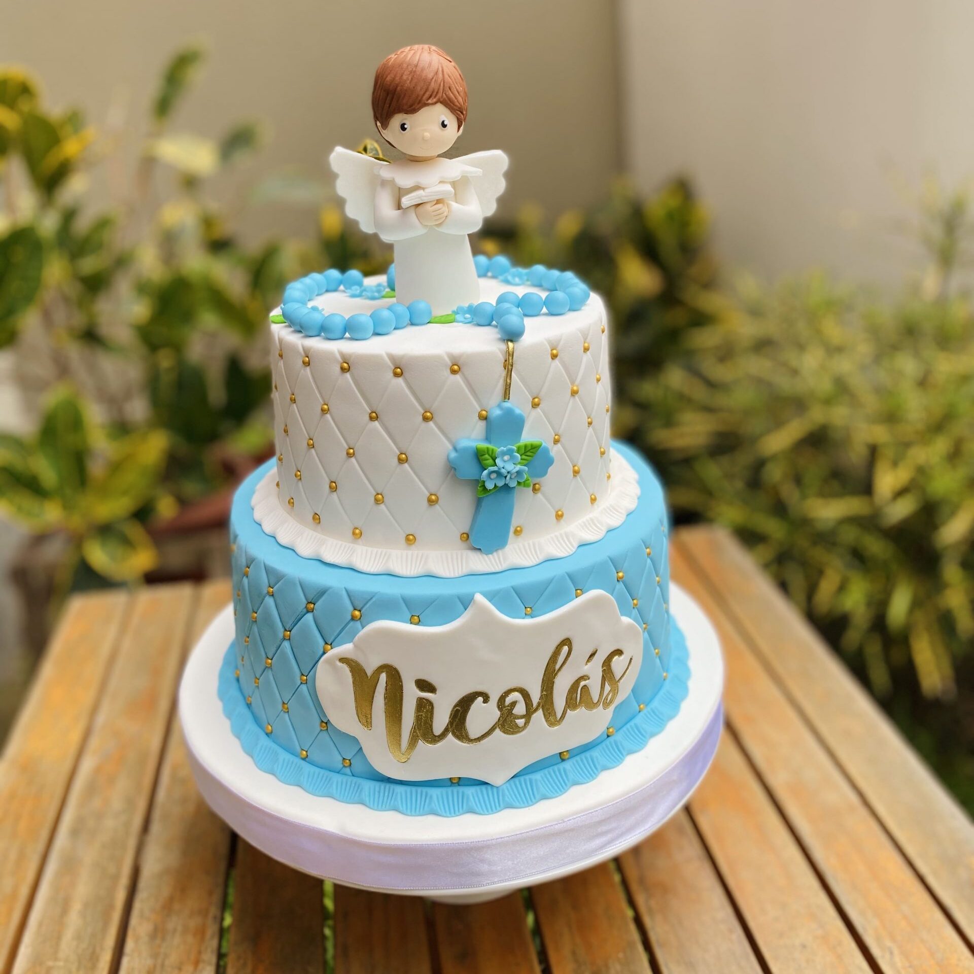 Celebra un momento tan especial con nuestra creación de dos pisos, forrada en fondant y trabajada con elegancia en textura capitoné adornada con perlas comestibles. El protagonista es un delicado niño modelado en 3D de azúcar, acompañado de un rosario igualmente elaborado a mano, símbolos de fe y ternura. Cada detalle convierte esta torta en el centro perfecto para recordar con dulzura y solemnidad un día único e inolvidable.