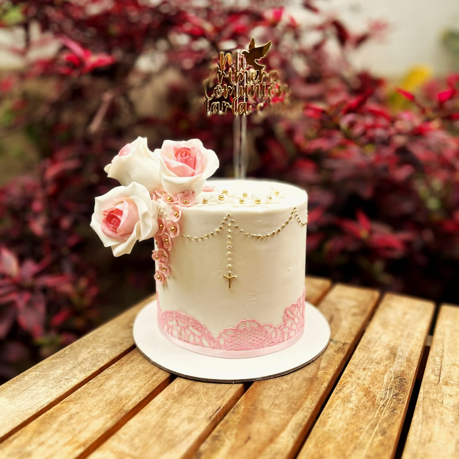 La decoración se completa con flores de azúcar en 3D, que le dan volumen, delicadeza y un acabado artesanal único. Además, incluye un topper de Primera Comunión en cartulina, perfecto para cerrar esta celebración tan especial. Una torta pensada para emocionar y compartir en familia. ✨✝️
