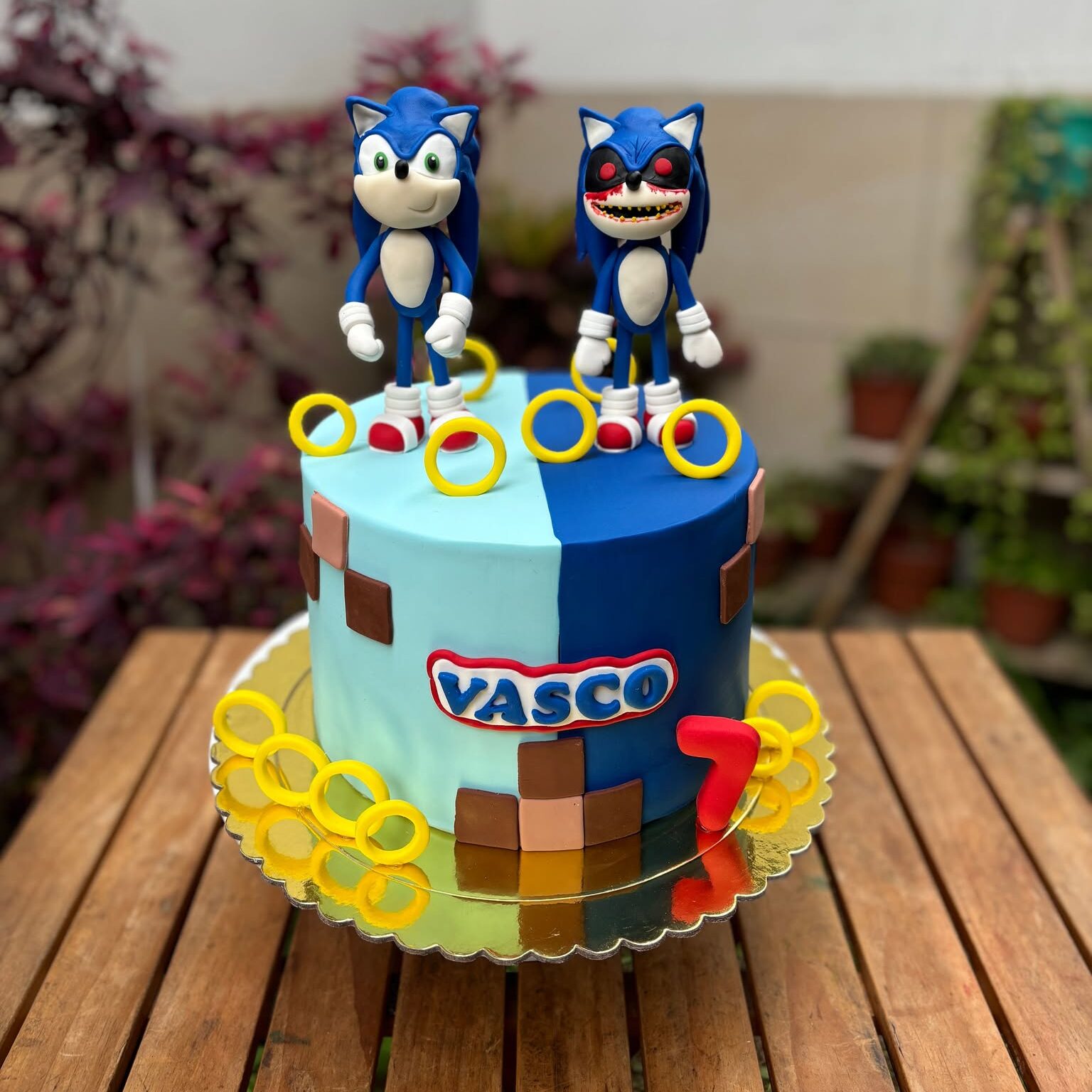 Celebra a toda velocidad y con un toque de rivalidad dulce con esta espectacular torta inspirada en Sonic. Forrada en vibrantes tonos celeste y azul, su diseño está dividido en dos mundos que se enfrentan: en un lado, el Sonic bueno; en el otro, su versión malvada, ambos modelados a mano en fondant con todo detalle.