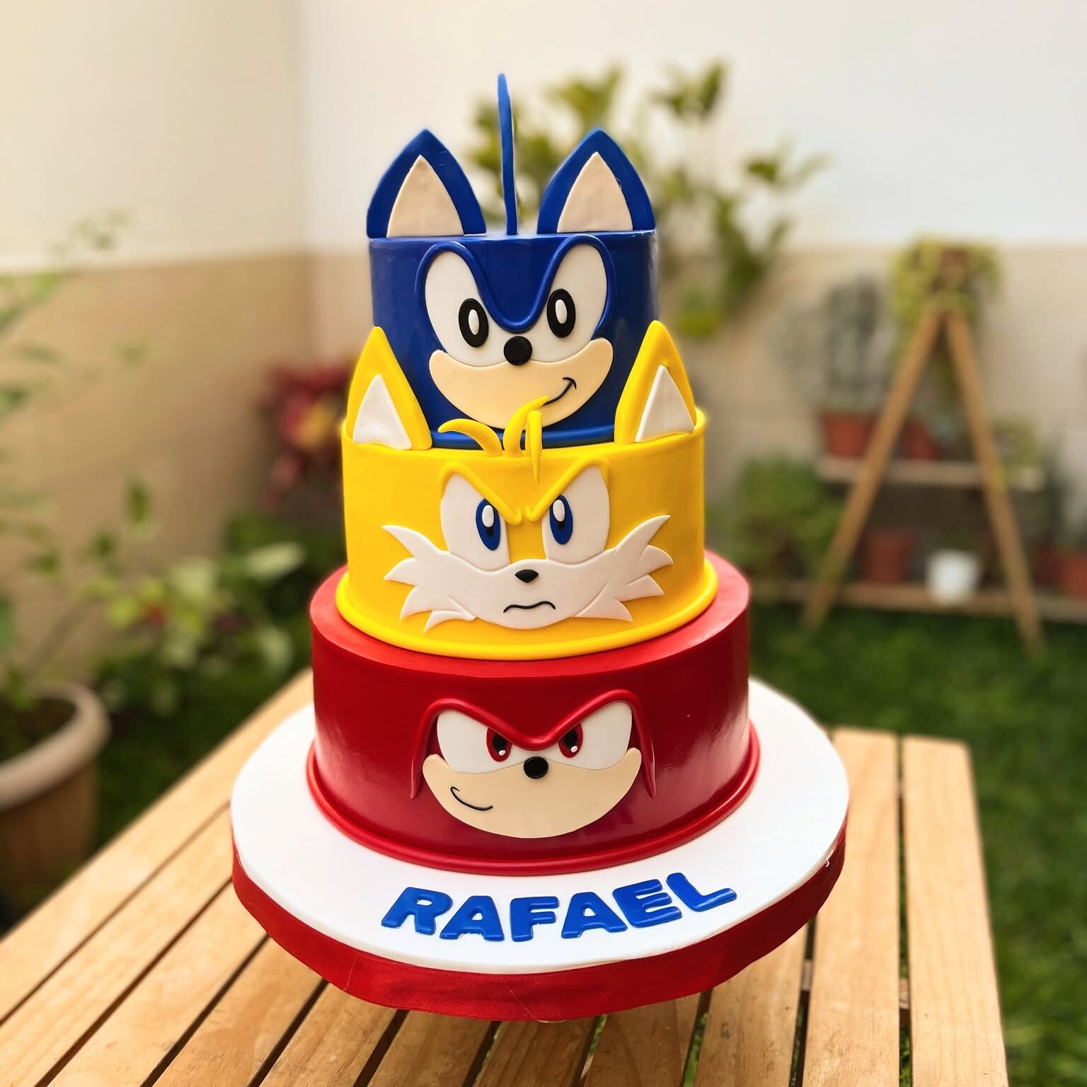 Celebra a toda velocidad y con dulzura con esta espectacular torta de tres pisos inspirada en Sonic y sus inseparables amigos. Forrada en vibrantes colores de fondant y con detalles modelados que recrean los rostros de Knuckles, Tails y Sonic, cada nivel captura la esencia de estos icónicos personajes.