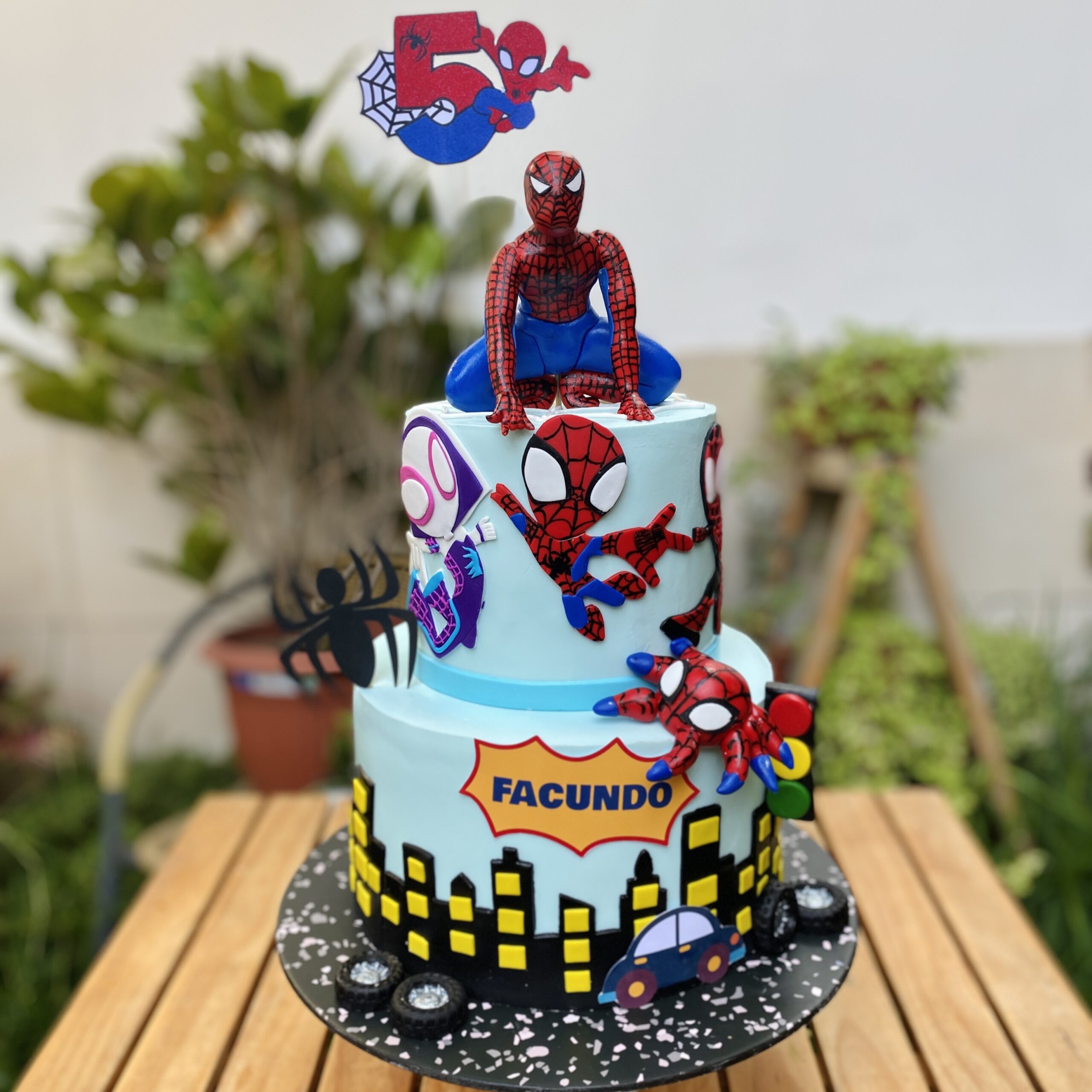 Nuestra torta de Spiderman de dos pisos está completamente decorada en fondant y diseñada para los fans del héroe arácnido que buscan una torta impactante y divertida. Cada piso está trabajado con decoraciones en 2D que representan las clásicas telarañas y elementos inspirados en la ciudad, creando un diseño dinámico y lleno de color.
