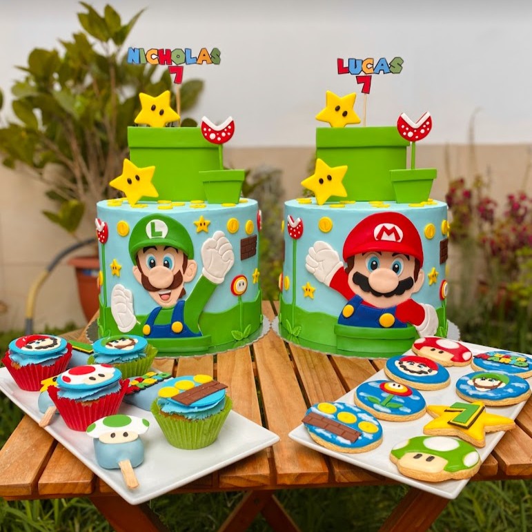 Nuestra torta temática de Mario Bros está completamente forrada en fondant y pensada para celebrar con color y diversión. El diseño incluye un personaje en 2D elaborado en fondant, que puede ser Mario o Luigi, acompañado de decoraciones en fondant 2D inspiradas en el icónico mundo del videojuego, como bloques, estrellas y elementos característicos del Reino Champiñón.