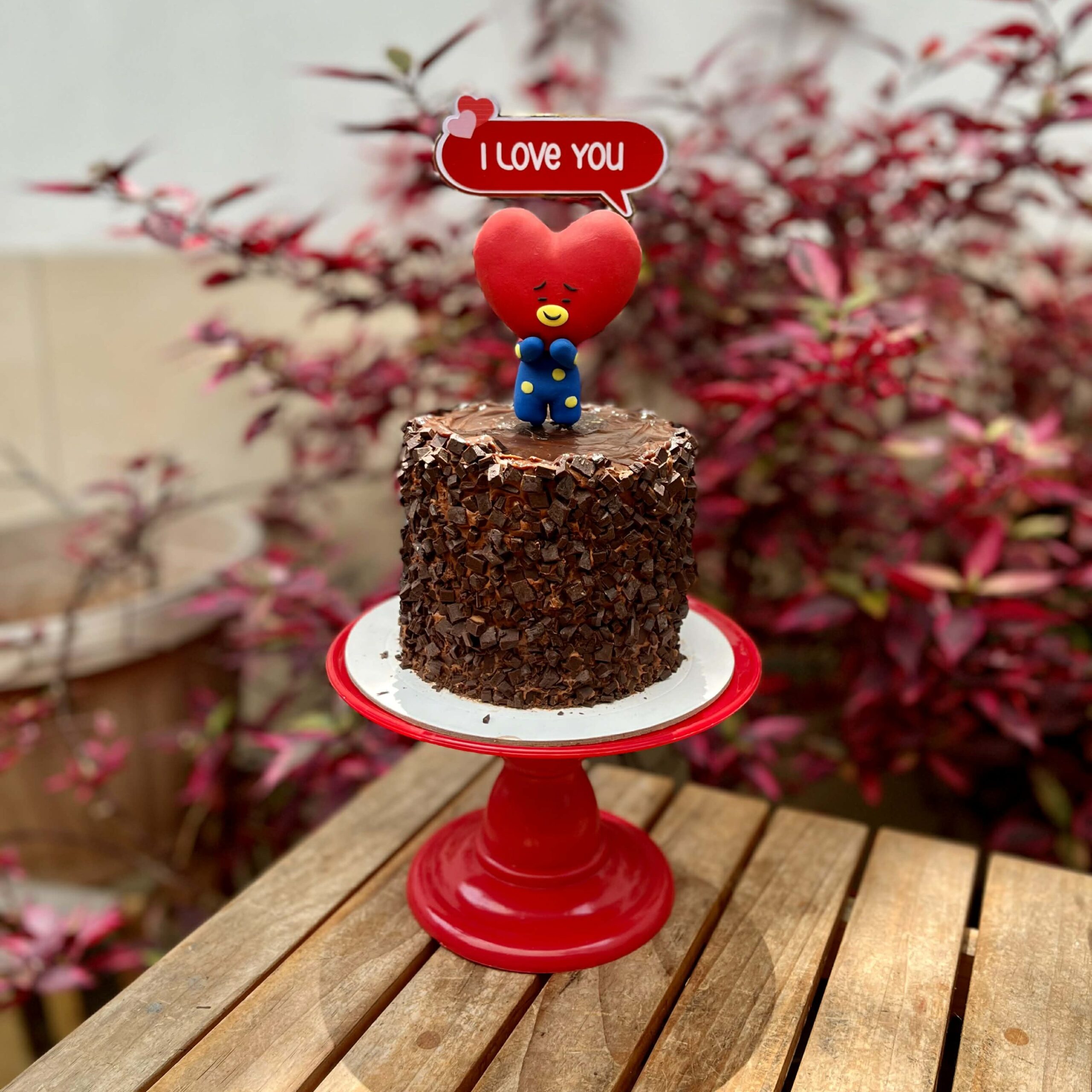 Celebra el amor con nuestra Mini Torta de Trocitos de Chocolate, una opción deliciosa y perfecta para sorprender este San Valentín. Elaborada con queque de chocolate, relleno de manjar y fudge, y coronada con una encantadora decoración en fondant 3D de Tata de BTS, ideal para fans que aman los detalles especiales.