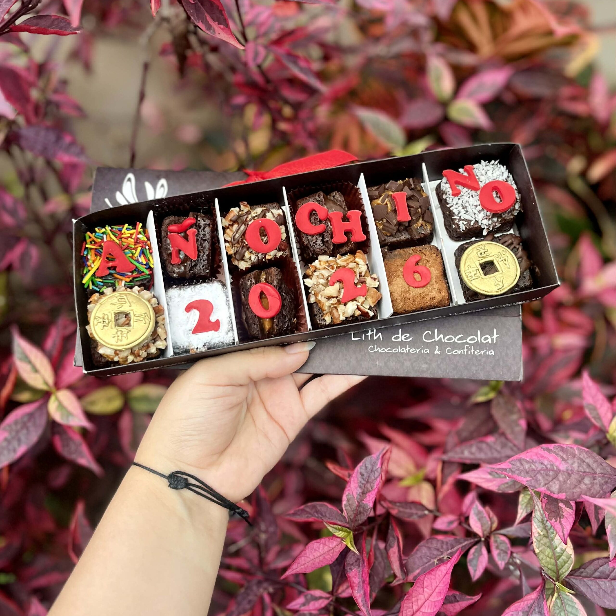 Explora la exquisitez de nuestra Cajita Vintage de Brownies Especiales, una joya de la repostería que celebra el Año Nuevo Chino. Contiene 12 mini brownies con una increíble variedad de toppings, como grageas, pecanas, azúcar impalpable, rayitas de chocolate, canela, coco, trocitos de chocolate, fudge y manjar. La decoración especial incluye el año 2026 y monedas doradas, todos elaborados con fondant comestible.
