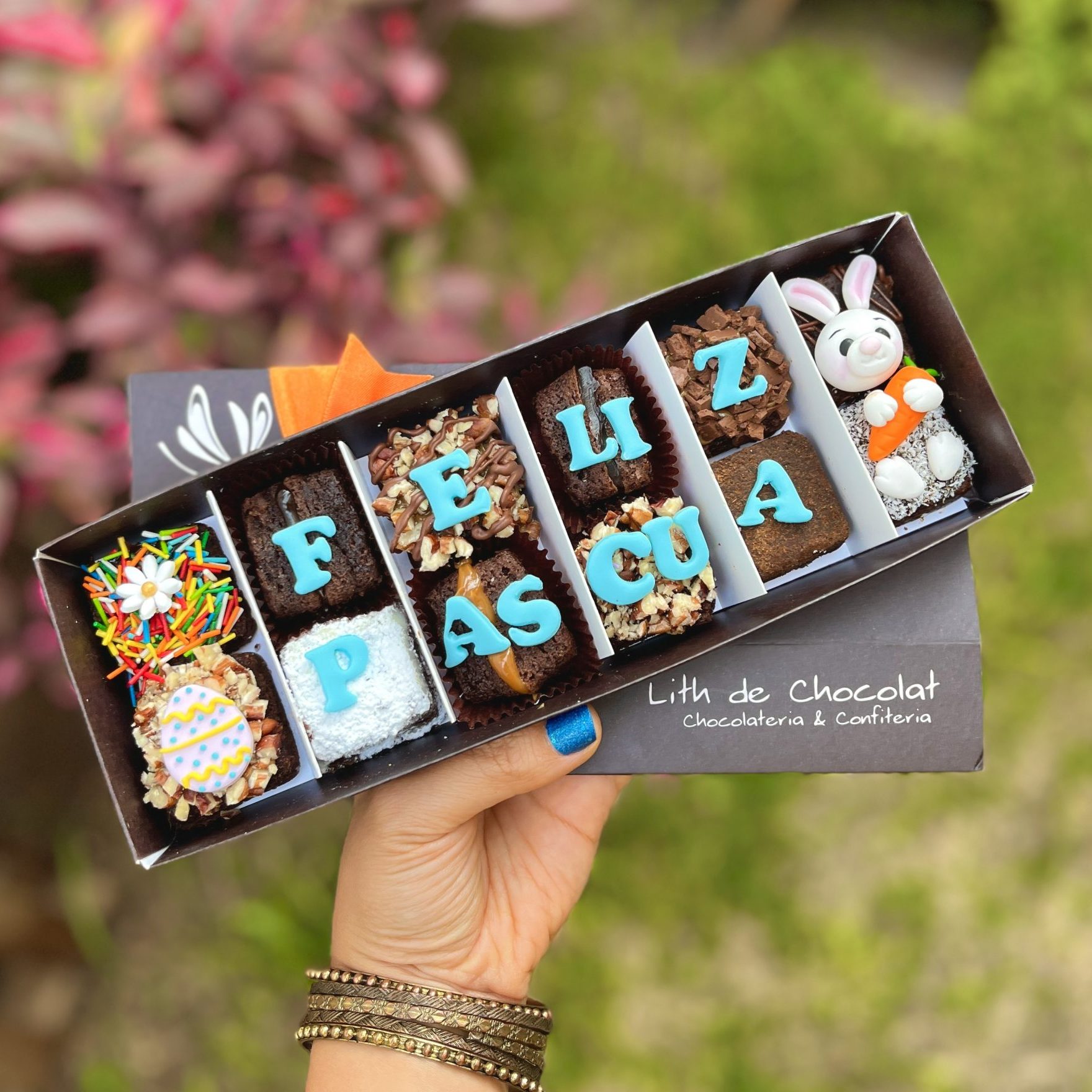 – Decoraciones Exclusivas: Nuestros brownies están decorados con figuras de Pascua elaboradas en fondant, todas comestibles y meticulosamente elaboradas a mano. Desde un conejito dividido en 2 brownies, con su cabecita en uno y sus patitas en otro, hasta un brownie con una linda florcita y otro con rayitas, acompañados de un huevito y una frase comestible distribuida en varios brownies que dice «FELIZ PASCUA».